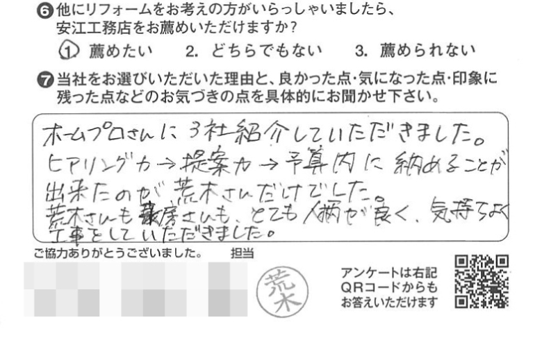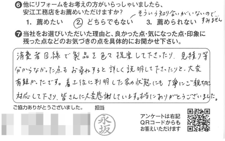 また、工事終了後、住まわれてから気づかれた不具合がないか、アフターメンテナンスはがきをお送りしております。