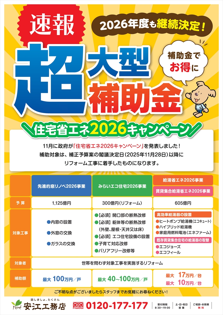 速報!住宅省エネ2026キャンペーンが発表されました! 補助対象は、補正予算案の閣議決定日(2025年11月28日)以降にリフォーム工事に着手したものになります。 当社では補助金活用のご相談も承っております。 お気軽にご相談ください!