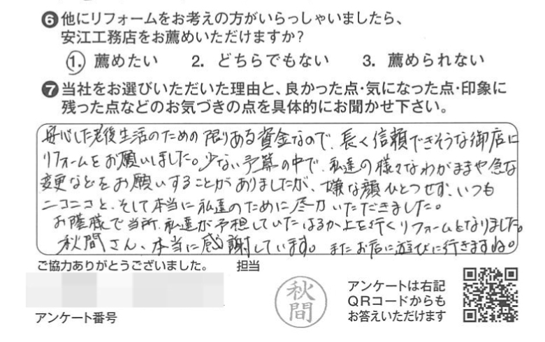 また、工事終了後、住まわれてから気づかれた不具合がないか、アフターメンテナンスはがきをお送りしております。