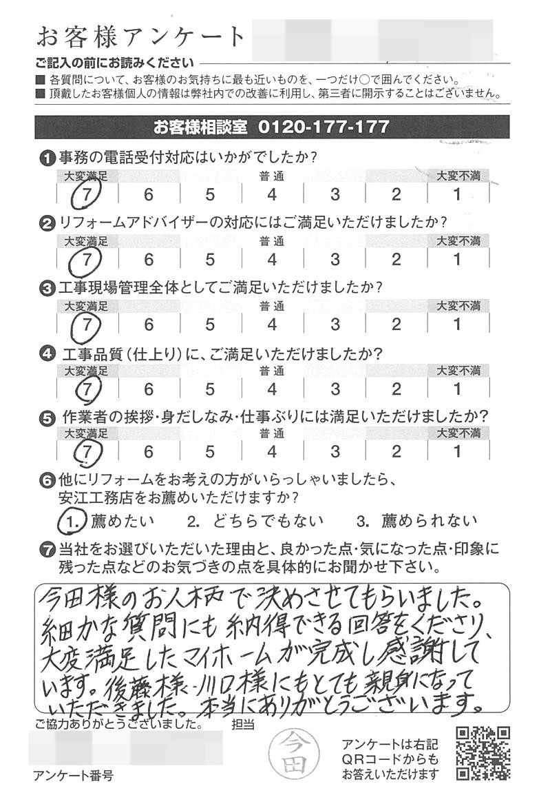 今田様のお人柄で決めさせてもらいました。細かな質問にも納得できる回答をくださり、大変満足したマイホームが完成し感謝しています。