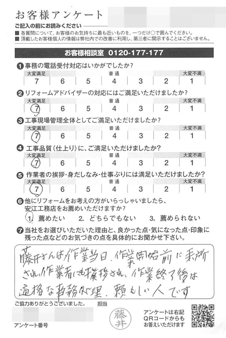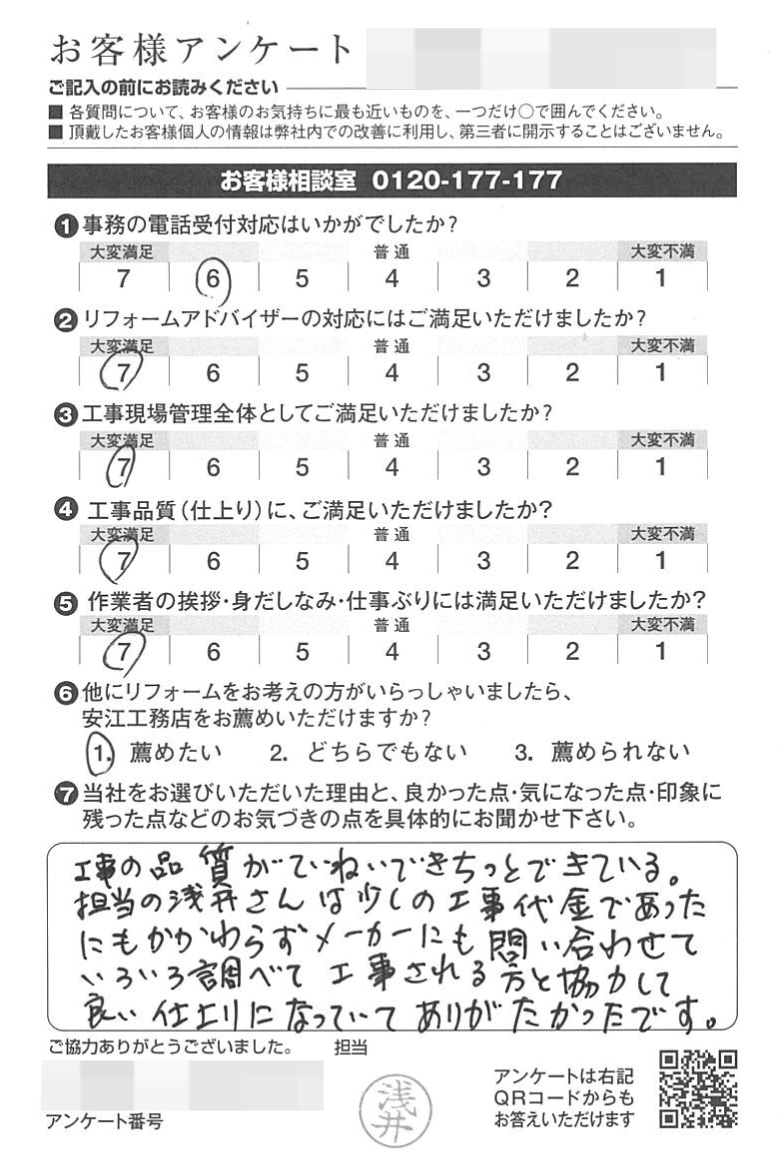 工事の品質が丁寧できちんとできている。担当の浅井さんは、少しの工事代金であったにも関わらず、メーカーにも問合せて色々調べ、工事される方と協力して良い仕上がりになっていてありがたかったです。