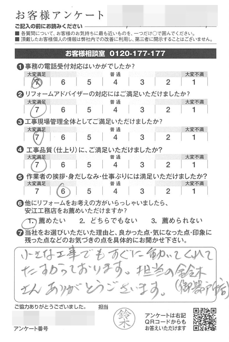小さな工事でもすぐに動いてくれて助かっております。担当の鈴木さんありがとうございます。