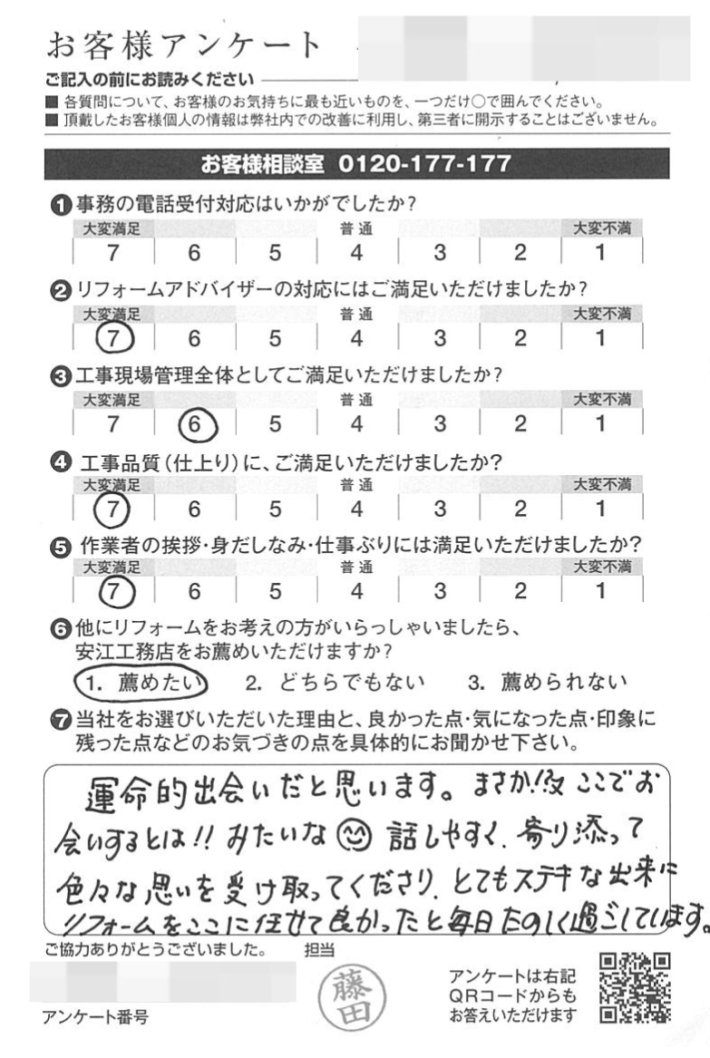 運命的出会いだと思います。まさか!?ここでお会いするとは!!みたいな。話しやすく、寄り添って色々な思いを受け取ってくださり、とてもステキな出来にリフォームをここに任せて良かったと毎日楽しく過ごしています。
