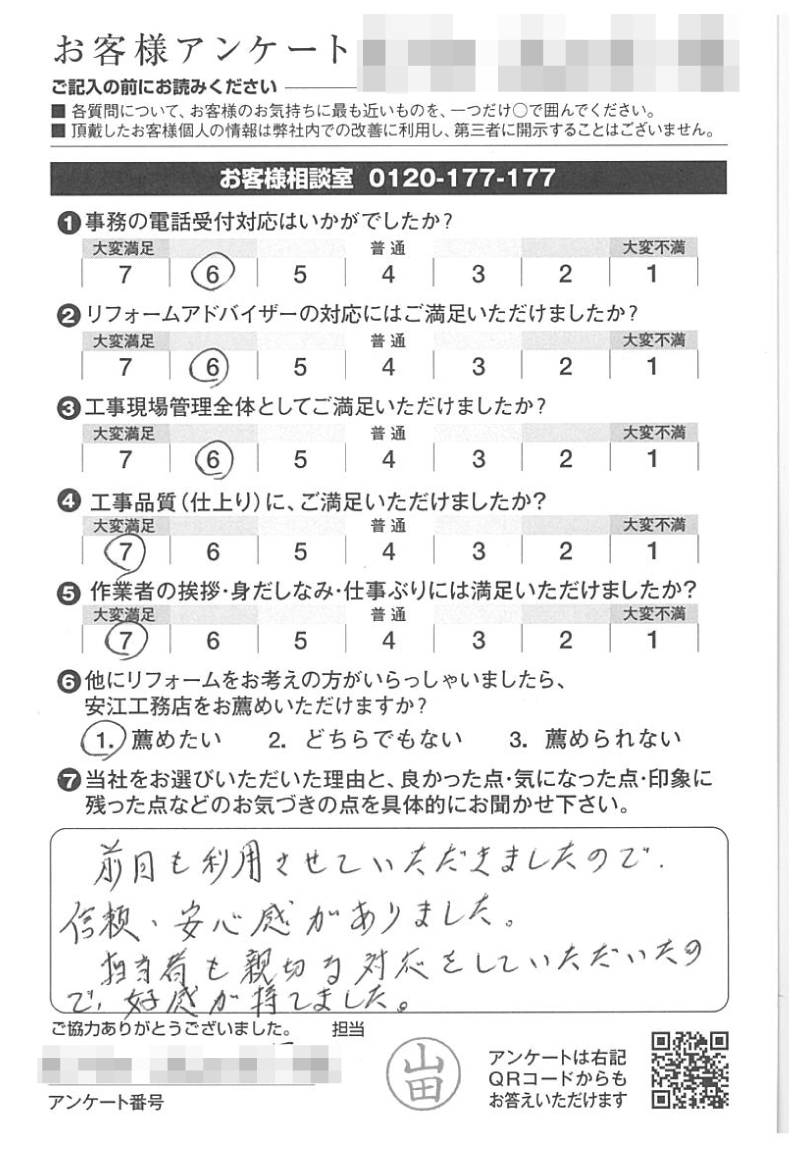前回も利用させていただきましたので、信頼、安心感がありました。担当者も親切な対応をしていただいたので、好感が持てました。
